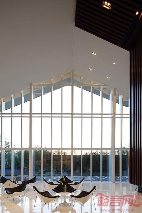 外部的“折”昭示着内部顶棚形态的动感。公共空间与办公空间分别采用了白色和木色,这两种不同颜色基调的划分恰好又组成了“折面”正与反。整个建筑在内部空间和外部表皮相互统一下将“橙”的主题烘托得浪漫而多彩。