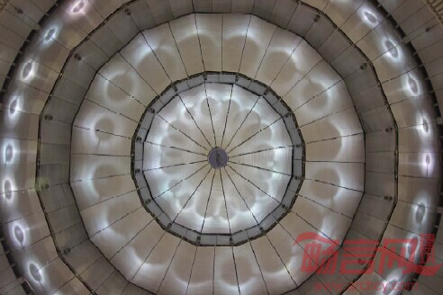 中心展馆的玻璃采光顶则首次采用新型索网与索穹顶组合支撑结构。轻盈的索结构体系与遮阳百叶相结合,同时采用玻璃作为屋面围护结构,形成精致的高技派风格,实现技术与艺术的完美统一。同时与周边粗狂的钢结构屋顶体系形成鲜明的对比,更加突出了其中心展馆的核心地位,使整体内部空间层次分明。