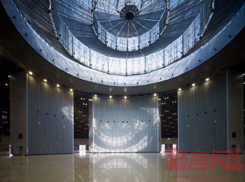 展览中心覆盖在穹型屋面之下,标准展馆高度从外围向圆心逐渐升高,最低点净高12m,满足一般展览的基本需求,中心展馆最低点净高20m,可以举办大型特殊展品的展览。展览中心各展馆覆盖在球形屋面之下,形成了非匀质化的净高空间,为多样化的展览内容提供了弹性。