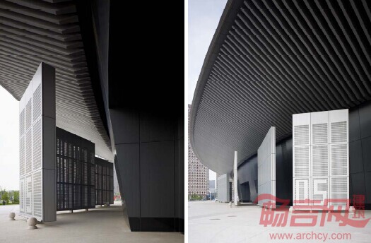 在展览中心外围飘蓬下,依据空气对流原理设计了48 片“空气导流光信息综合功能叶片”。一则,叶片有效营造了展馆周围人流循环区域舒适宜人的“小气候”;二则,在叶片中镶嵌的LED 光源矩阵,同时使叶片成为48 块巨型信息发布银屏;再则,于叶片的下边和顶部凹槽安装了泛光照明的装置系统;多功能的叶片装置为“一石多鸟”之举,不仅在技术上解决了诸多问题,在建筑的美学层面也增添了灵活跃动的元素。