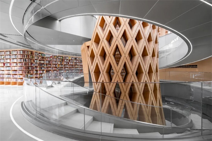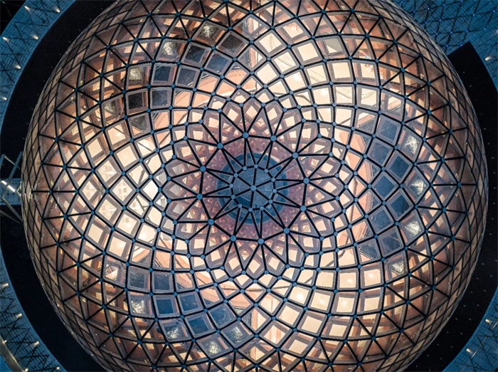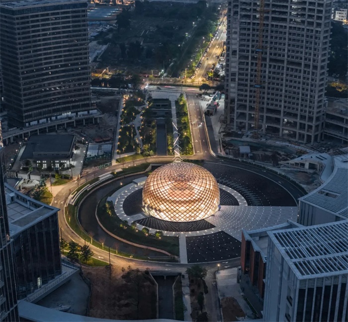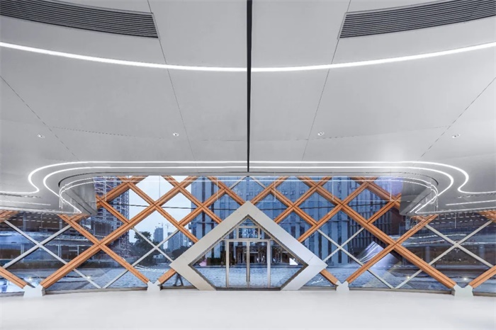 展示中心建筑由球形网壳胶合木结构与主体钢结构两个独立体系组合而成。球形网壳胶合木结构源于“红杉树”概念原型,从场地中央“拔地而起”,接近玻璃幕墙顶部时散落而下,从而整体网壳形成一种类似“苹果核”的几何形态,交织的木结构网壳象征着多学科、多专业、多团队的相互支撑、共同成长,永攀学术高峰并在国家各个角落开枝散叶,铸造辉煌。