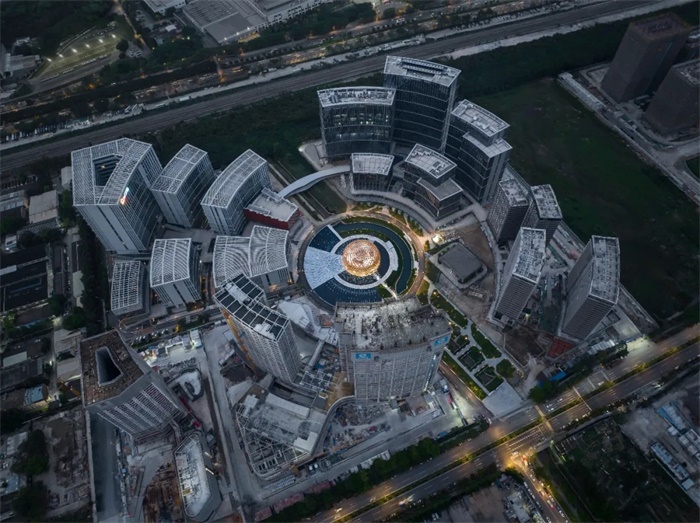 建筑主体功能区域均为钢框架结构,由相互间隔 120° 的两个楼梯间与后勤设备间形成的三组“核心筒”作为主要竖向支撑结构,从而使得二、三层楼板悬挑而出,打造出无柱悬浮功能空间,进一步加强了展示中心室内的纯粹性与通透性。