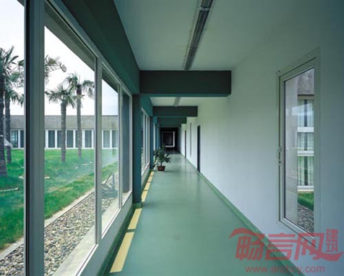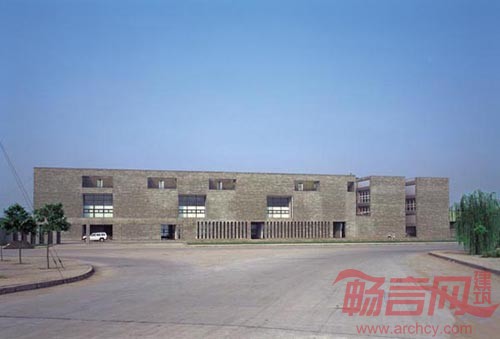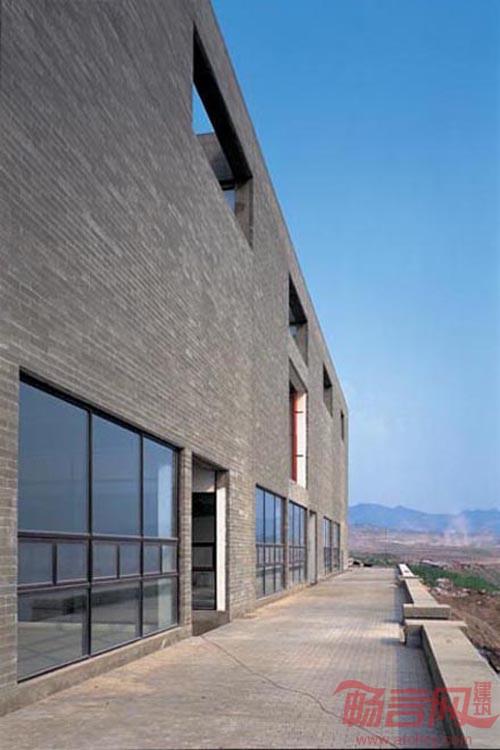 基地建在重庆长江南岸高新科技开发区内,除了实验室外,它包括了研究、办公、展览、生活等设施与空间,基地则是临长江并平行于江面的不大的一块带状地带,基地的紧凑和功能的复杂促成了一栋单一的线性建筑,这个线性又是由若干相对独立的部分组成。这暗示其复合的使用:实验室、研究、办公、生活等,及各种行为之间的关联。立面上两道平行的混凝土砌块墙以及墙上孔洞及缝隙的变化正体现了这种整体与局部的辨证关系。建筑内部每个不同的使用分区又具有不同的空间组织。