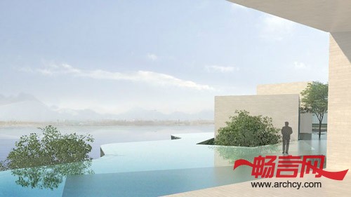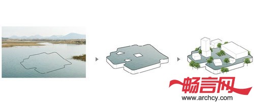我们希望通过古老的空间模式重构现场的自然景观。于是从中心湖内借出一片水,置于首层屋顶。会所的体育设施位于水面之下,而建筑中最需要景观的房间,则以小屋聚落的方式散布在水面之上。无边水池柔化了建筑边界与环境的关系,在近处倒影着小屋和建筑内外的树丛,在远处与湖面及远山相接。人们在浮木般的步道上穿行,既能感知风,阳光,空气,水体,树影等自然,又有机缘与不同的人相遇,游走之间,聚落的空间和瞬时的风景随机变化,人对自然的体验得到了丰富和延展。