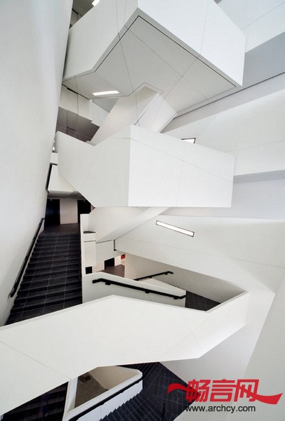 中心的外墙上有许多玻璃窗,交叉的光线在室内天花板上形成一块块光影。