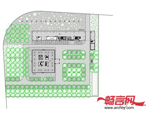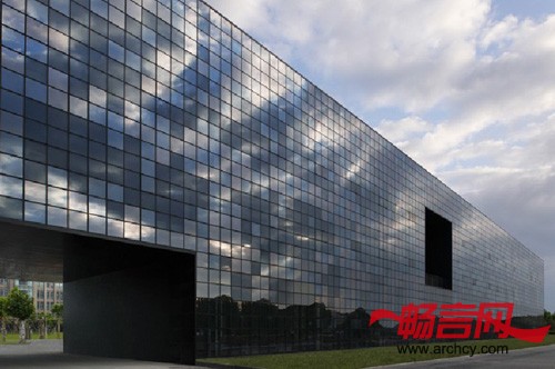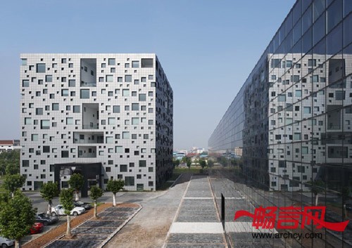 在呈网格状,种有100棵大树如公园般的地块中,两个体块被搁置其中,一个为32米见方的"正方体”,一个为55米长的"长方体”。”正方体”采用中央核心筒,是九层高的办公楼。委托方希望所有的办公房间需要具有的特征是独立性,通风好,建筑的中央部分有自然光。
