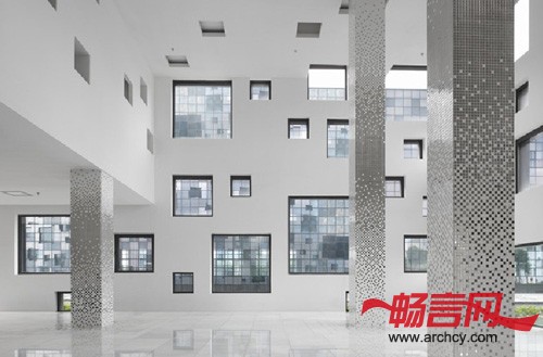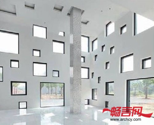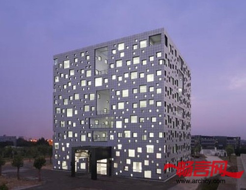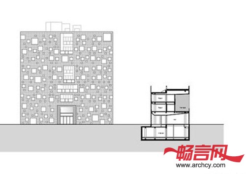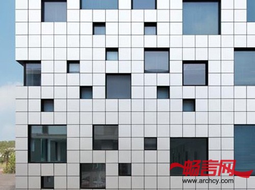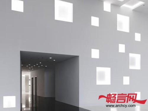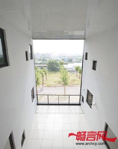 第一个要求还容易实现,剩下的两个要求,以一般的做法是与建筑形态相悖的。但是,通过把十字形走廊横贯中央部位的核心筒,并把东西南北四个立面的阳台和走廊相连接的方法,解决了建筑物的中央部分的自然采光和通风。阳台是通过高度和宽度双方的变化而发生变化的。另外通过大、中、小三种窗户随意地分布,在"正方体”上营造出夊杂而富有变化的开口图案。