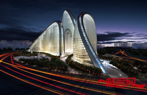 这座大量使用了玻璃和铝板建成的摩天大楼高200米,外形像几座小山,非常漂亮。此外,这里还将栽种一些树木,并将开发一个人工湖。