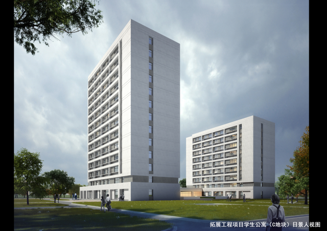 学生公寓(C地块)由1栋13层北楼、1栋9层南楼及裙楼构成。建筑面积18400平方米,其中地上建筑面积16000平方米,地下建筑面积2400平方米。