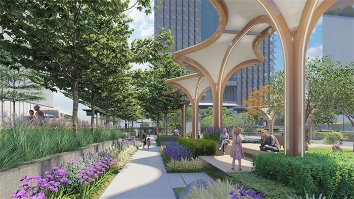 本项目景观以线性元素为设计语言,通过列植的乔木及片植的灌木强调地块的整体性及轴线感,形成舒朗简约的绿化空间,不仅让身处其中的游人感受到自然、轻松浪漫,也为高处塔楼的办公人员提供新鲜的视野,满足城市的多元需求。