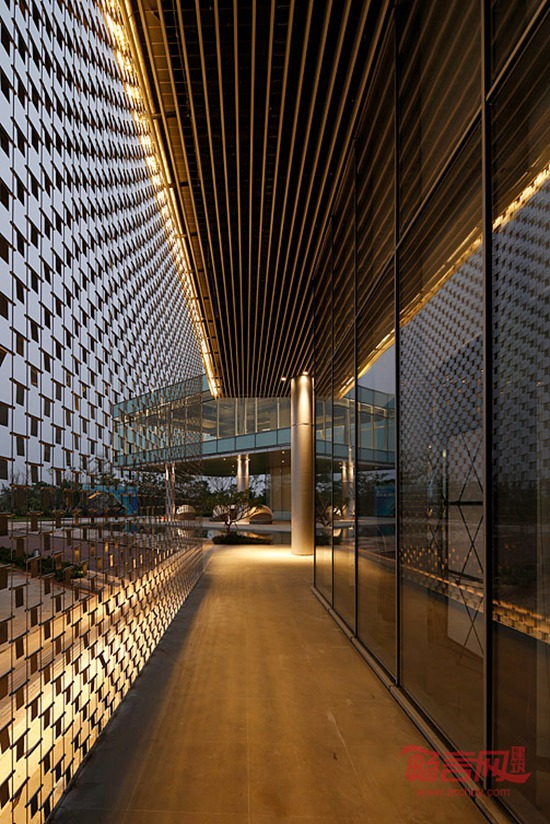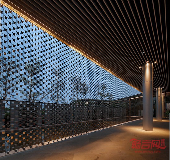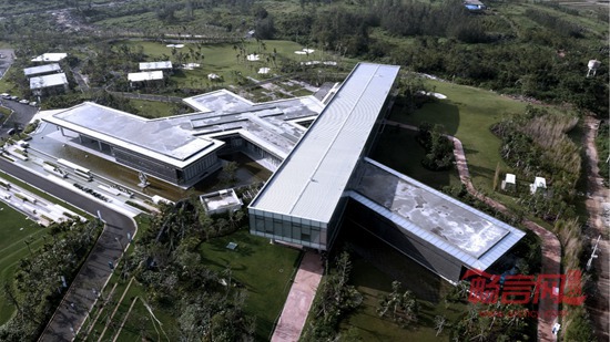 材质上的运用是另外一个设计的突破点,吸取海南建筑文化的独特精华,建筑主体采用海南专有的火山岩,呈横向条形排布,就地取材,混合以镜面不锈钢,将建筑的古朴特质,海南独特的历史文化气息和现代感同时表达。在重要空间采用幕墙外挂金属风片,在海风的吹拂下,波光粼粼,仿若不远处的五源河水。