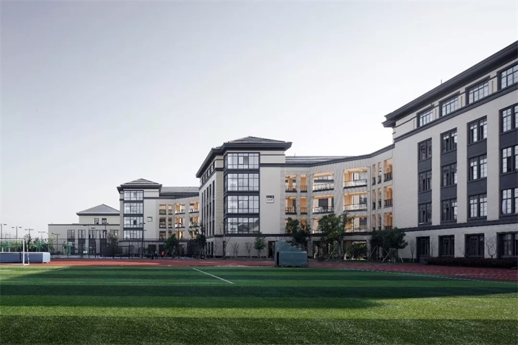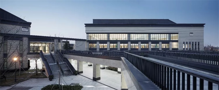 校园建筑风格简洁实用,摒弃浮华造作,体现江南新中式的现代意境。综合区三大公共建筑利用自身的空间变化营造三个不同维度的金属斜屋面,形成错落有致的节奏,大面的实虚对比及富有韵律感的外窗也体现着精致的尺寸控制和立面语言。主要的教学及宿舍建筑利用深灰色屋顶和横向线条营造大气典雅的氛围,经久耐看。