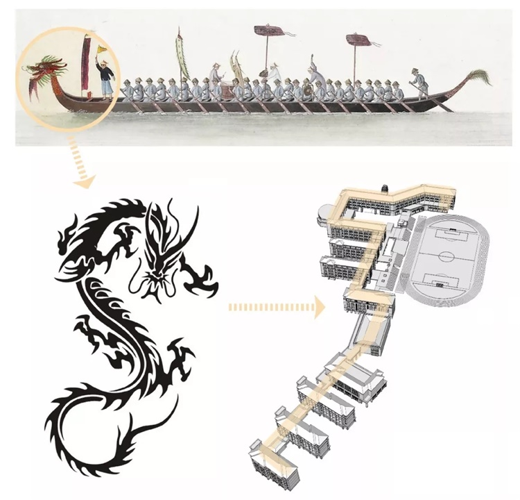 五常的湿地文化体现着江南水乡最独特的韵味,五常的龙舟文化体现着当地人民拼搏不息的精神。所以校园采用湿地书院的理念打造新中式的建筑风格,取形舒展飞驰的腾龙串联整体的建筑格局。
