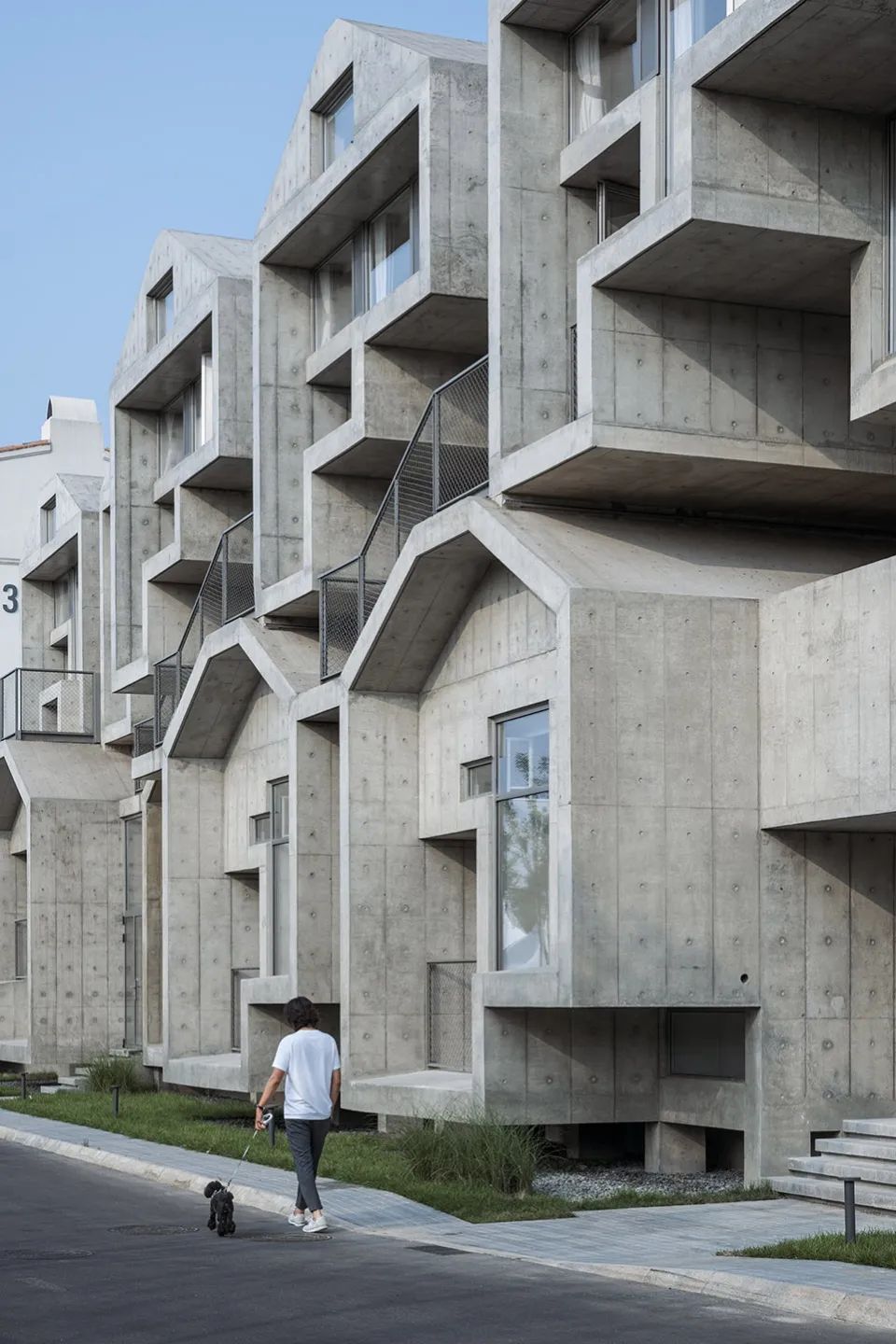 自打阿那亚最南端这个三角形“边角料”地块被定位成宠物酒店之后,建筑师和业主关于人和狗的思考就从未停止过。一个小酒店的设计模式无非就是低层的廊式、散落的独栋式,或者是非常流行的“一个大托盘一堆小盒子”的复合式。从人的使用角度来说,几种模式都可以。但养过狗的人都知道,狗时不时遇到别的狗的时候,它们会很开心,但人不开心,因为闹的慌。所以,在非必要时间应当尽量避免狗和狗的相遇。于是,在方案初期,就回避了廊式布局,在独立式和联排式之间有些纠结。
