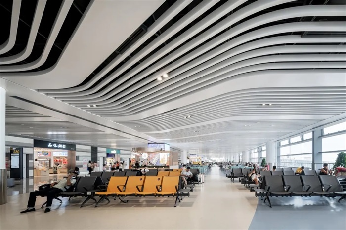 另外,中庭吊顶采用点状分布的灯光设置,夜幕降临后,灯光闪烁,旅客仿佛置身浩瀚银河星空下的蓬莱仙境,为旅客营造出令人难忘的出行体验。指廊取意丰富多变的海岛风情;吊顶采用波浪式结构,商业立面采用海岛独特的岩层效果。候机区配置有各具特色的景观休闲区,旅客可以在放松休息,商务人士在此办公,儿童在此娱乐嬉戏。