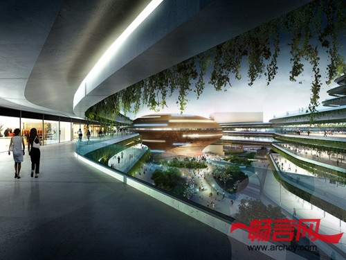 作为建筑门户的通道与泛光照明,LED发光积木块也是“超级城墙”的分隔点。这些巨墙之间的空隙,透露出内部植栽柔软有机的绿化台阶建筑和街道,形成一座巨型的神秘花园。而在项目中心区的台阶建筑,以雕塑造型反映行人活动流线。沿起伏的台阶建筑山谷空间,或打开形成开放式广场,或收缩形成私密的阴凉庭院。