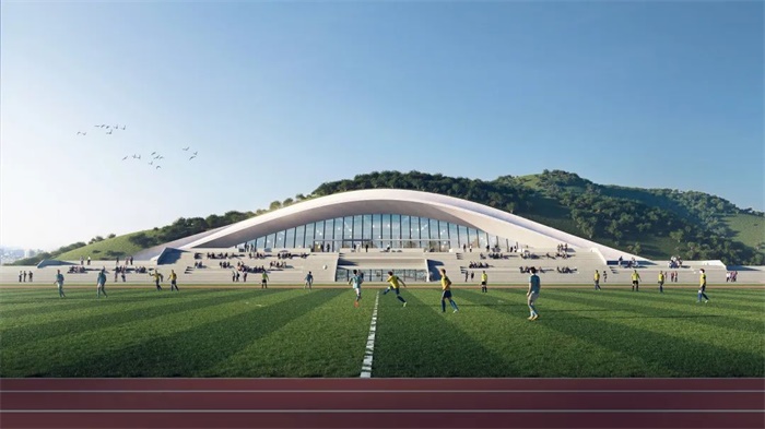 陆上运动中心与山体结合,形成整体外观轮廓。在节地及优化土方的功能诉求下,将运动功能拓展到绿地之中;同时与二期水上运动中心形成紧密互动,将健康促进反映在校园环境中。多层次的步道体系为建筑组团之间提供了便捷的通道。
