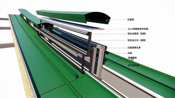 校园中堂采用一体化屋面技术,为建筑屋面提供采光、遮荫和通风引导。为实现协和传统琉璃绿色屋顶之美,我们采用京西琉璃渠具有工法美感的琉璃瓦片,结合尺寸模数相同的节能幕墙工艺,形成传统工艺与高科技相交织的复合调性。