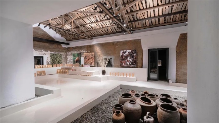 我们将油坊面对河道和茶田的窗洞口扩大打开,拆除部分原有墙体,将景观引入到建筑内部,加建面向河道的廊道和延伸进茶田的平台,通过改善流线来增强室内外的空间互动。油坊面向内院的立面不做新建,仅拆除后期局部加建的构筑,以达到风貌的还原和统一,将内院作为一个同过去记忆对话的空间。
