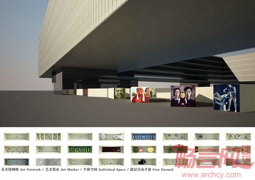 建筑师的策略就是避免国家美术馆成为一个远离城市中心的孤立个体,或者单纯地成为展览场地的新成员,而是把它变成进一步推动和发展城市艺术展览的网络服务器和终端平台。这个艺术网络出现、存在、并且服务于城市的现实空间与日常生活。提议包括三个内容:建立一个国家艺术捷运(National Arts Express)系统;使国家美术馆建筑生产具有张力的社会公共空间,广场上散布的艺术箱体与国家艺术捷运系统相兼容共同运作;美术馆建筑围合了一个空旷的内园,它可以通过架空的底层自由到达,这个内园是个不定形的空间,作为一个超越现实空间的“别处”,等待被艺术品和艺术事件不断地填充。