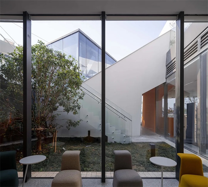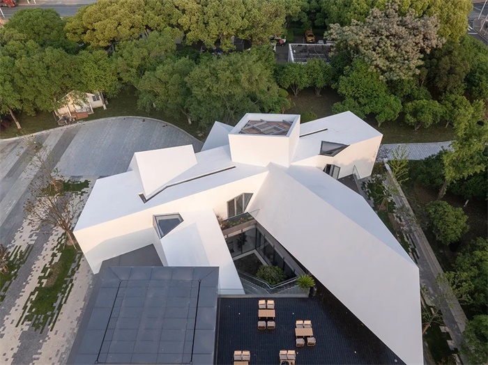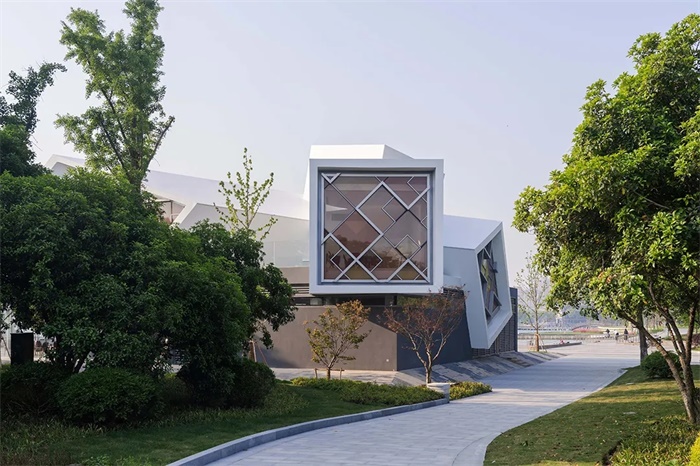 地形设计上运用单纯的草坪地坡,加以形象树的烘托,突出了建筑雕塑感和存在感;绿植和草坪,有机地从基地中生长,并以单纯的几何体与自然环境对比呼应。