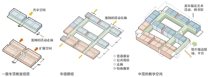 从体量配置到设计发展,首先要问什么是适合学生的院落尺度?如果规范里25m的间距与24m的高度决定了院落尺度的基本模数,每个院落能容纳几个年级和几个班级的学习空间?就南方的气候条件,如何调控尺度,形成平衡日照与日晒的舒适空间?如何穿插空间、联系院落,使院落既统一又兼具特色?