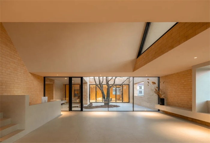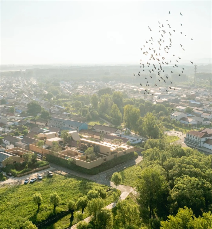 ARVO 16:30 酒店项目位于马营村边缘的西北角,与村外山野一路之隔。这次我们收起以往设计中的一丝跳脱,没再试图给山谷停一座飞船或者在大地上画匹大马,而是模仿隐入自然的马营城堡,将村中几个院子归整到一处,也搭一座城堡,在里面接住探出围墙的树,外观上看起来几乎完全融进村庄场景。淡黄色的建筑和村里老玉米的中黄、夯土城堡的土黄深深浅浅地同色辉映,让建筑充分接纳村庄的原有生活状态。