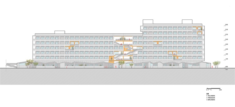 此外,设计在教室与地面集中活动场地之间创造了中间层级的活动场地,让课间短暂的时间也能让学生充分玩耍。把教学楼和宿舍楼局部的体块掏空形成半开放的活动空间,将掏空与开洞这种二维的建筑元素增加了一维,表面上看是把原有的实体空间减少了一部分,实则掏空的部分成为了学生课外活动、接触自然的场所,增加了整体空间的丰富程度,反而达到了100-1=101的效果。并且,活动空间被设计为统一的明黄色,配合午间阳光的光影效果,为校园增添活力的同时增强辨识度与归属感,促进学生们的沟通交流。