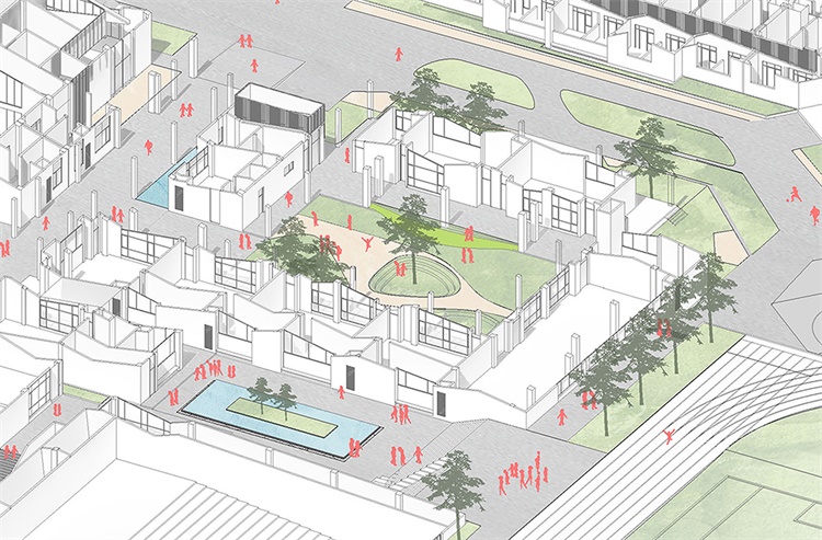 为此,校园中的教育活动场所不应仅着眼于教室,而是以城市规划的视野作为出发点。校园首层的建筑形态以当地江南水乡的坡屋顶建筑为原型进行排列组合,并置入了“街道”、“巷弄”、“院子”、“口袋公园”等有趣友好的场所,强化校园的“社区感”,“大街小巷”之间互相连通,并连接着一个个小而美、小而亲的场所,生态开放,恬静安逸,为孩子们带来“浸润式”的教学空间体验,引发孩子们互动玩耍、学习交流的热情。