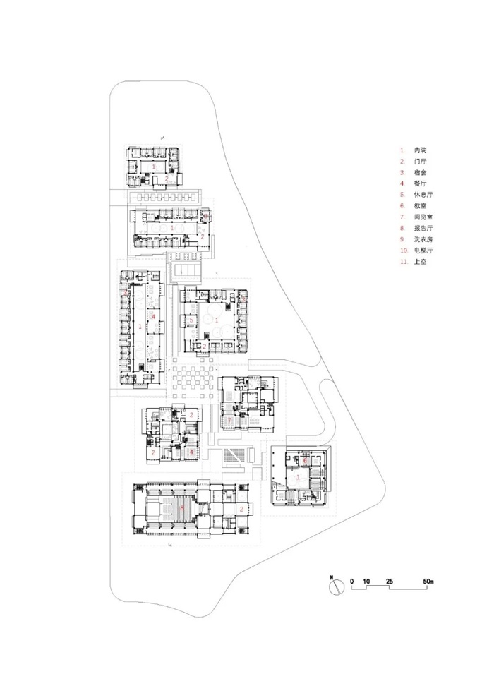 为了达到建筑与自然融合的目标,首先,我们采取化整为零的策略,将内容丰富的交流中心拆解成由8栋4层高的建筑组成的群体。8栋建筑承担的功能分别为宿舍楼(4栋)、活动中心、阅览楼、教学楼及报告厅。