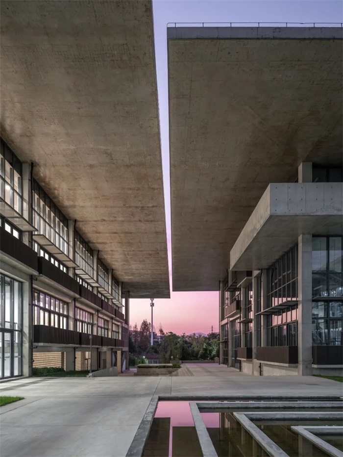 进而,我们打破建筑的封闭性,为单体建筑设计了从中心向边缘的四层空间:中心庭院(室外)、空调区(室内)、廊下(半室内)、檐下(半室外),后二者可视为绝对室内与绝对室外之间的过渡,即灰空间。由悬挑屋顶覆盖、进深10米的檐下空间继承了中国建筑木构深檐的传统,赋予了建筑单体一个伞形的剖面。