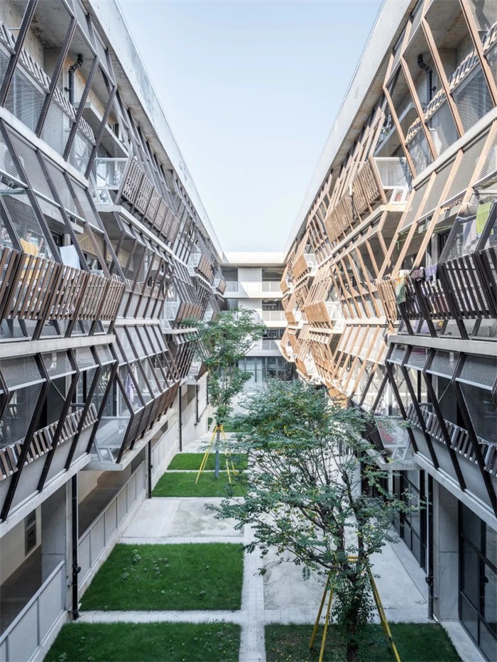 我们将8个单体的檐下都置在一个平面上,将该建筑群的屋顶连成一片概念或抽象的连续树冠,仅被3个大院落,其中2个为四合1个为三合,和8个小院落及单体之间50厘米宽的缝隙穿破。
