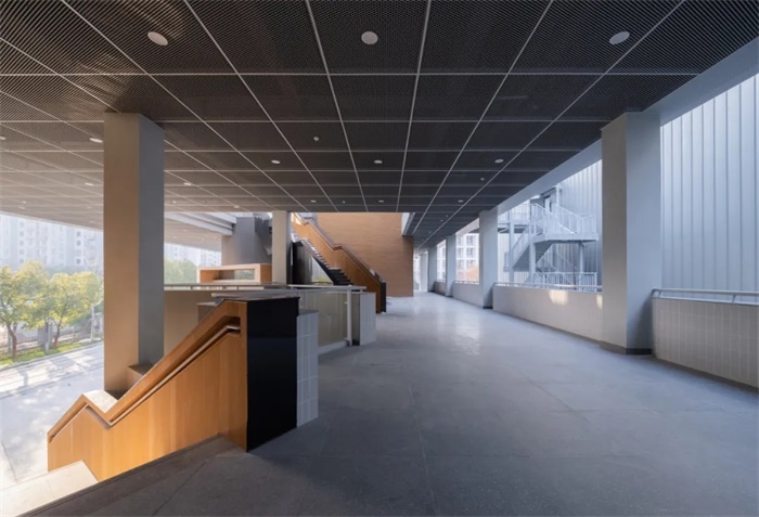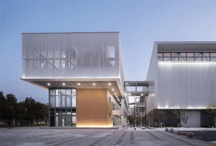 这个全新的实训建筑,就像是一个码放一堆“箱子”的货架,一二层的“箱子”三三两两堆放得较为松散,而中部的“箱子”还特意扭转了一个角度,使得这个“货架”充满空隙,让建筑四周的场地空间相互渗透。第三层的建筑形体是一个出挑的“大盒子”,这一层由三个高大空间组成,其中两个作为实训场地、一个作为学术报告厅使用。整个三层的建筑外墙表面被上下渐变的瓦楞穿孔铝板所覆盖,在形成引人注目的城市标志形象的同时也有效的调节了东西向的光照。为了顺应城市道路的走向,“大盒子”在东南部的出挑逐渐增大,这些造型出挑为下部的出入口周边创造出一圈有遮蔽的场所。