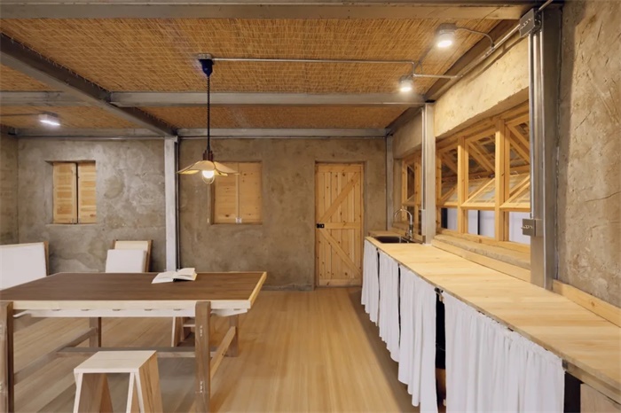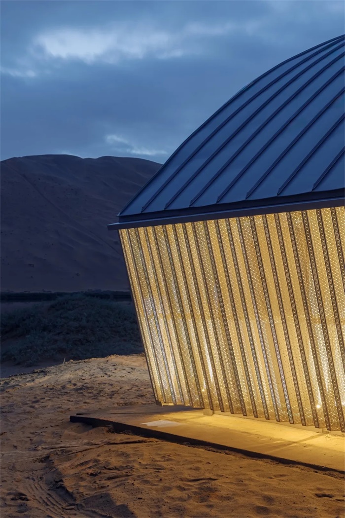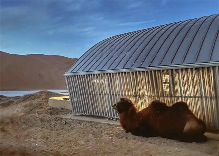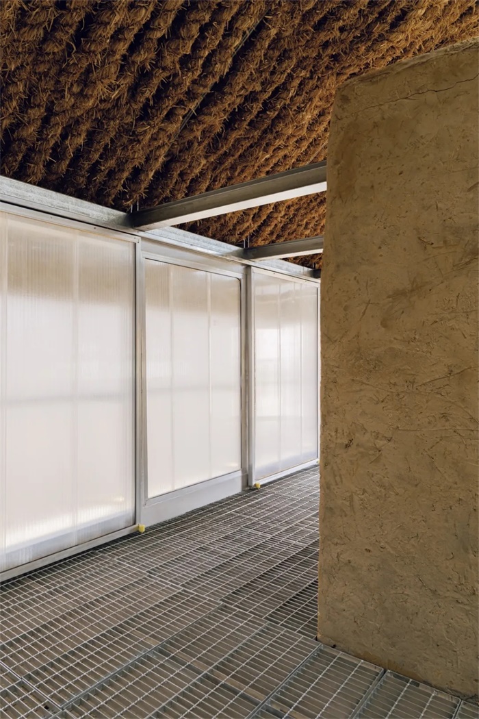 通过对当地遗留的芦苇房、梭梭棚屋等既有乡土建筑设计智慧的学习,就地取材,发掘当地草泥型建造技艺。芦苇编织拱形钢桁架屋顶的设计灵感来源于沙漠中一处失落的蒙古包群,设计创新性地将乡村常见的拱形钢桁架、方管、金属屋面板等现代材料与木椽子、草绳等自然材料结合起来使用。