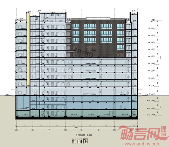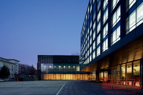 追求材料的表现力:建筑外墙采用深灰色的陶土砖,浅灰色的双层中空LOW-E玻璃,银灰色的槽钢分层线和外窗框,通过仔细的比例推敲和材料组合,表现出建筑的材料特征和精美感。