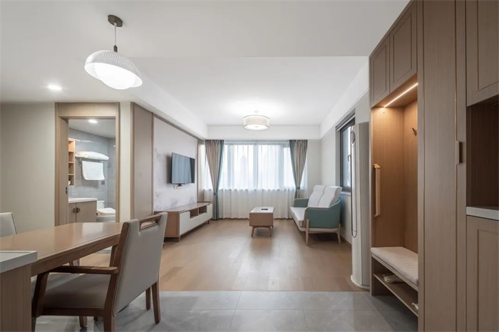 两条轴线的中间交叉点是整个项目的空间和形象焦点,我们在这里设计了一个超尺度的灰空间,担负起整个项目的落客区功能,方中套圆的形态,适度轻奢的材料选择,都比较好地体现了颐养中心作为太湖健康城综合配套中心的地位和作用。