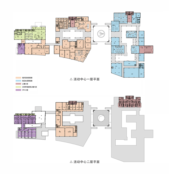 护理院北边是规划中的医院,与护理院联系比较紧密;而社区中的公共配套,则临近酒店区和度假型老年公寓布置,更方便开展活动。这样的布局,不仅方便紧急状况下的分区管理,也有利于日常运营。