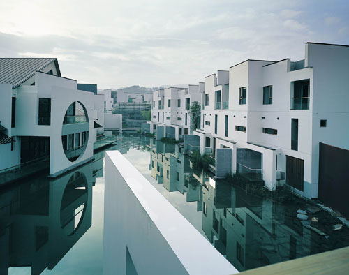 位于社区紧邻城市干道的商业街和社区图书馆与住宅区之间以池塘相隔,小桥相连,互为景观。其内部空间也特别强调了各种开敞、半开敞、下沉的院落和连廊组合,形成丰富而使人流连的"村口"场所。