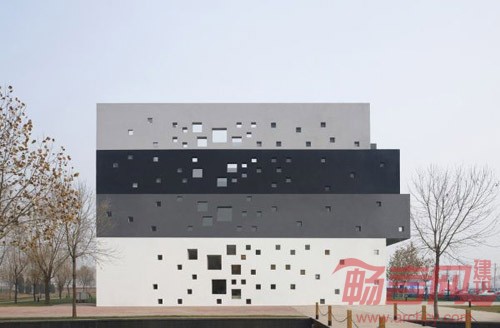 建筑外观由许多单独的管子叠加而成。它由白色、浅灰色、深灰色和黑色四种颜色的管子组成。这些管子不断地重叠、累加,形成了凹凸感。
