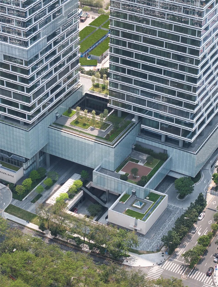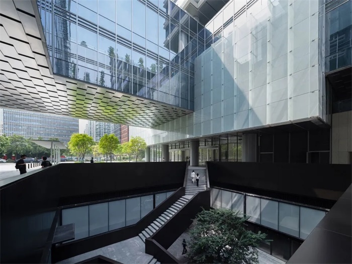 在空间设计上,通过地景引入、立体绿化、空中庭院、下沉广场方式将自然元素融入建筑之中,在高密度办公楼中营造舒适、人性化的研发办公微环境。