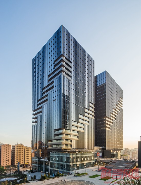 低区开放式办公空间整体形态采用退台处理,弱化人视感觉上的压迫感,并且也使得整个低层“云空间”场景丰富,尺度适宜。在造型上也力求简洁干净,立面主要采用石材和玻璃的材料处理,运用体块穿插的变化,从而丰富了低区的视觉感受。