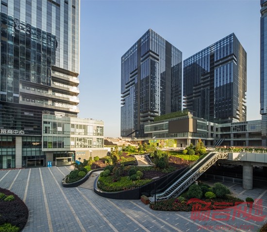 “坡地景观公园”是一条与“云空间”垂直的位于71米标高处的开放式公园,它与各办公楼宇之间是一种开放式的联系,让整个景观资源融入到每一栋办公大楼,办公大楼的入口大厅是一个全开放式的设计,使在此处工作的人能更多的感受自然新颖的空间场所。坡地景观公园与低区办公是一种立体化的联系,为的是将人流可以更好的导入每一个公共性办公区域。错落有致的平台,宽敞的休闲步道,开放的运动设施,精致独特的公共空间,让工作在此的人群享受到了一种愉快、舒适的工作环境。