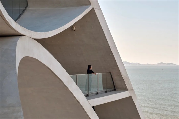 建筑高50米,底边是一个直径50米的正圆,主体为白色清水混凝土。时光塔的形态来自太阳的运动轨迹,以剖开的结构面向大海,希望在地球面临气候危机的当下,重新唤起人们对于时间和自然现象的觉知,让人在这个独一无二的地点,通过建筑跟宇宙星辰和自然循环建立起关联。