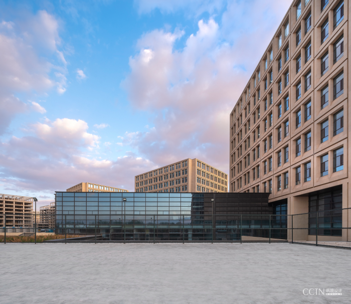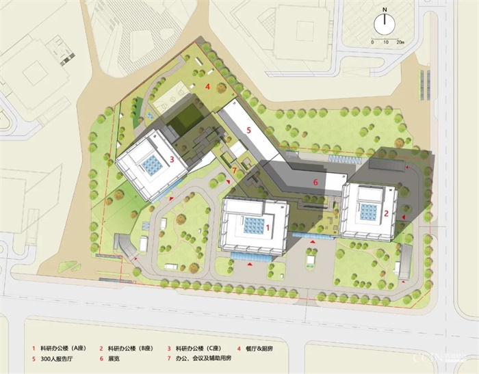 二、三层设有办公、会议室、实验室、档案室及室外走廊等高品质的办公环境,并在裙房顶配有景观绿化、休闲小憩的空间;餐厅上方屋顶还配有篮球场;种种人性化的设计贯穿整个项目。