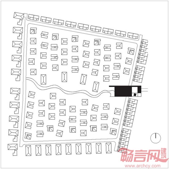 要实现风景中的建筑需要一种手段。渡上采用现代的表现手法实现传统的设计理念,将别墅区的设计分为3个层次。在第一层次中用4米高的石材围墙将基地围合成一个院落,宛如吴冠中先生在国画中表现的自然风景中的村落,借助于东西两侧的自然风景林带,构成诗情画意的第一重院落;在第二层次中,每个邻里组团也被设计成院落式的格局,指状渗入的风景将每个邻里组团分割成绿色环绕的绿岛,别墅一层的石材围墙围合成一个组团尺度的邻里庭院空间;第三层次为每栋建筑,它们都有自己的入口空间,前庭、回廊和后花园构成一个私密而丰富的私家院落。三重院落的导入实现了风景与建筑的统一。
