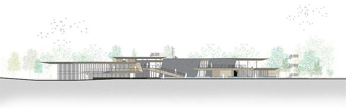 设计以简单的原型出发来塑造丰富的空间关系:一方面我们参考了儿童折纸形态,将5个C型单元的“纸片”嵌套形成基础构型,另一方面翻折的屋檐宛如轻盈的风鸢轻展翅膀,悬停于钱塘江畔。