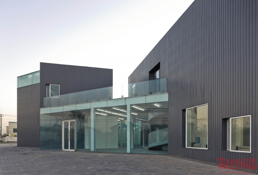 建筑外表皮采用深灰色压型钢板,满足造价的限制,也是对这个地段原有的工业历史保留片段记忆。