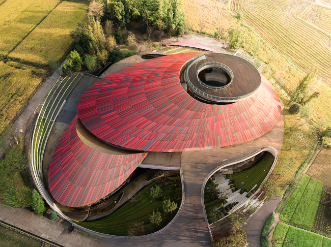 项目从自北向南逐渐抬升的田地为出发点,以一个豆瓣般的椭圆曲面作为屋面主体,北侧一片小屋面从场地上升至展厅屋顶,南侧的小屋面嵌入下沉庭院。三片屋面与地形的变化相呼应,相互交叠,尽显川西屋顶的轻盈自由。