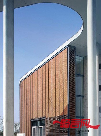 建筑造型强调典雅、庄重、宁静的文化氛围。首先通过虚空间将几幢建筑联为一个整体,虚空间同时还作为从城市观赏龙山森林公园的景框; 其次通过浅色花岗岩墙面、型钢、木百叶等材料的精心组织,创造出一个雅致亲切的整体形象。木色和浅色墙面的对比,再配以绿色的山体,整体格调十分明快。此外,建筑东西立面采用了光感可调遮阳百叶新技术,降低了建筑能耗。