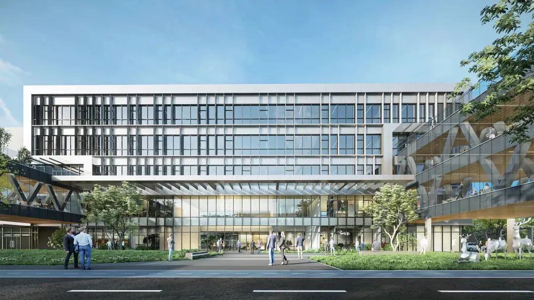 多层建筑的形态不仅完美与既有建筑相融合,也因标准层每层使用面积较大,建筑整体利用率与经济性高。建筑外立面材料选用既有建筑的铝板幕墙与玻璃幕墙,外立面形象与既有建筑和谐共生形成一个整体的园区形象。